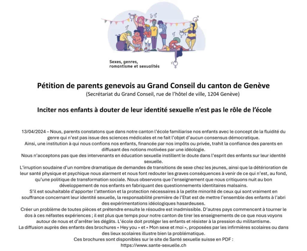 Pétition du 13 février 2024. Nous, parents résidant en Suisse romande, constatons que l’école publique familiarise nos enfants avec des concepts qui ne sont pas issus des sciences médicales et n’ont fait l’objet d’aucun débat démocratique.